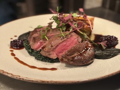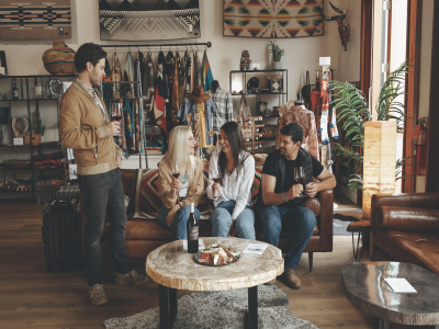 After a few more tastings, Kendall checks her pass’ map view for somewhere they can eat. Tinte Cellars, 0.2 miles away, is the perfect spot.